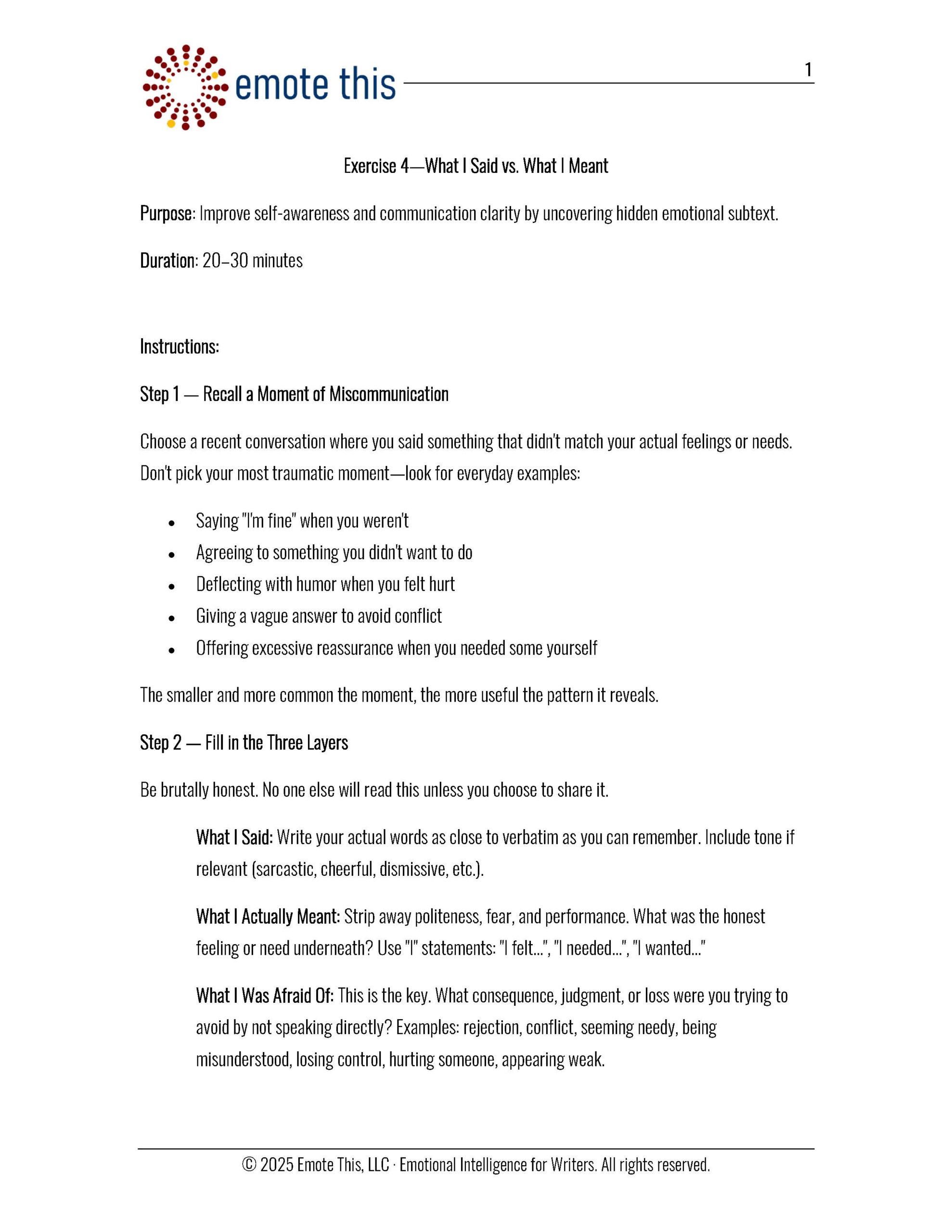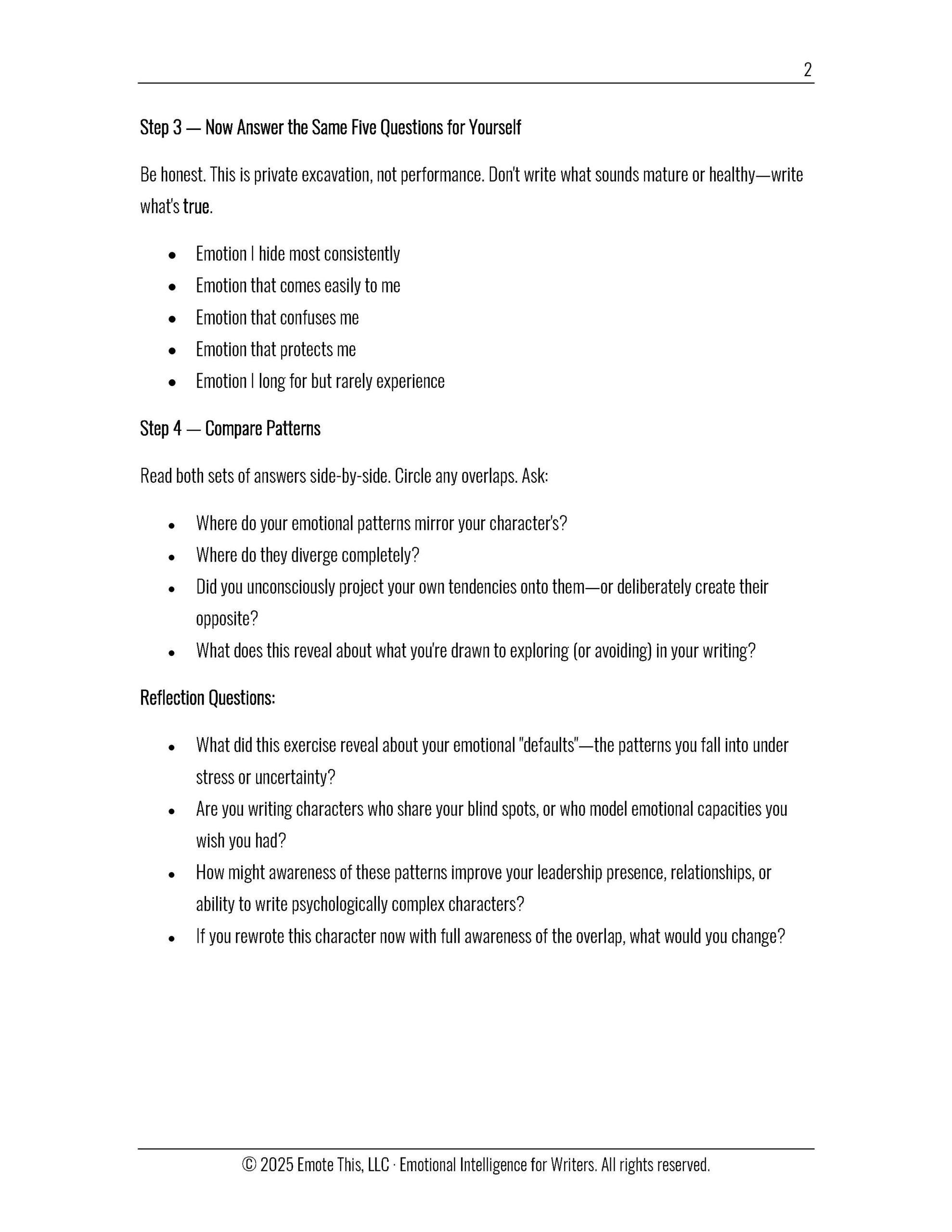 You can work through the exercises in order or return to individual ones as needed. Some are introspective, others are explicitly craft-focused, and several sit at the intersection of the two—where emotional awareness becomes narrative choice.
